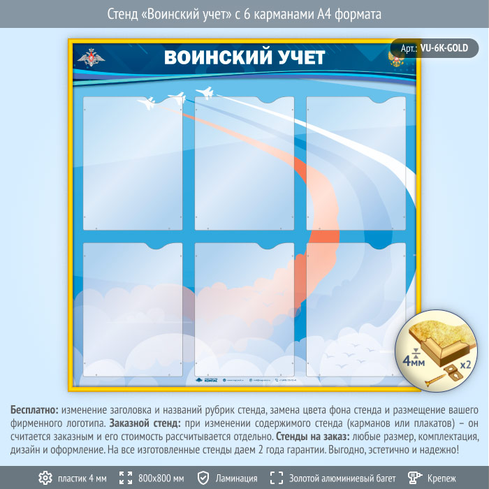 Стенд «Воинский учет» с 6 карманами А4 формата (VU-6K-GOLD) в Бердске купить