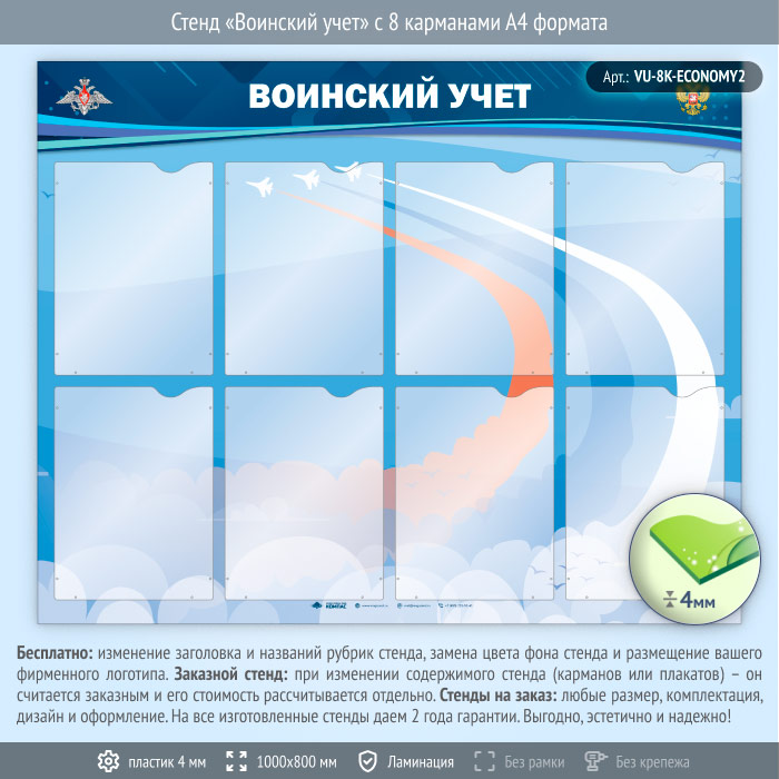 Стенд «Воинский учет» с 8 карманами А4 формата (VU-8K-ECONOMY2) в Бердске купить