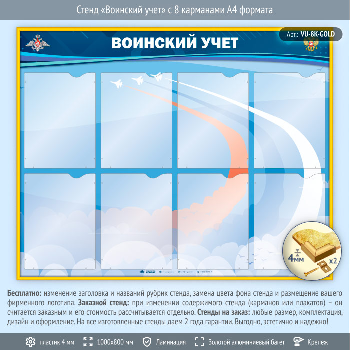 Стенд «Воинский учет» с 8 карманами А4 формата (VU-8K-GOLD) в Бердске купить