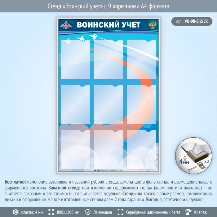 Стенд «Воинский учет» с 9 карманами А4 формата (VU-9K-SILVER) в Бердске купить