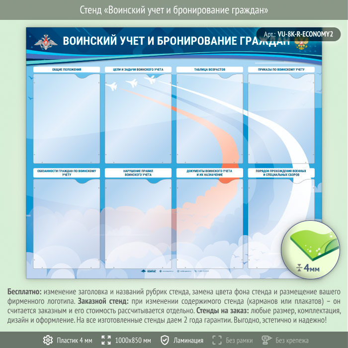 Стенд «Воинский учет и бронирование граждан» с 8 карманами А4 формата (VU-8K-R-ECONOMY2) в Бердске купить