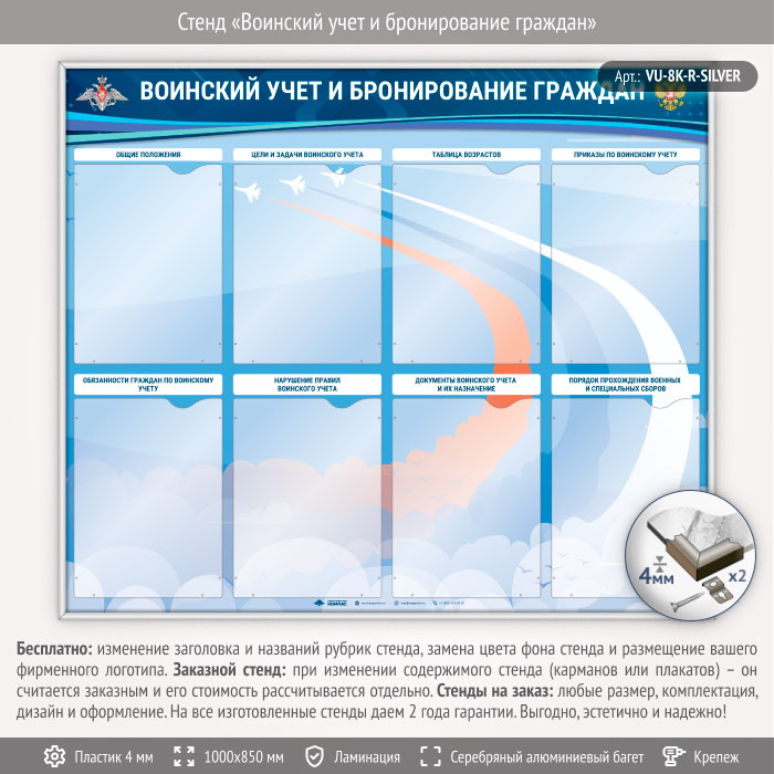 Стенд «Воинский учет и бронирование граждан» с 8 карманами А4 формата (VU-8K-R-SILVER) в Бердске купить