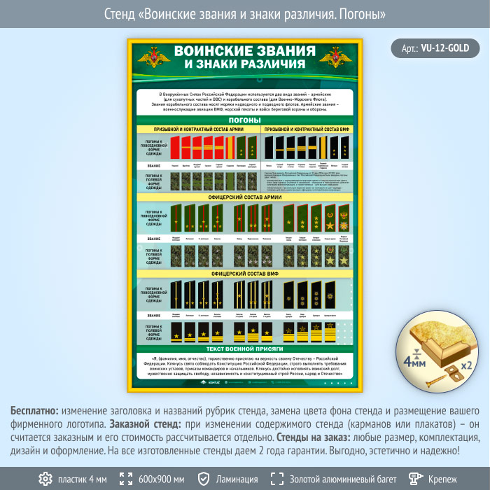 Стенд «Воинские звания и знаки различия. Погоны» (VU-12-GOLD) в Бердске купить