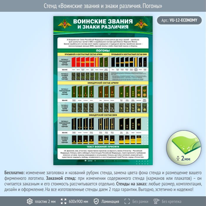 Стенд «Воинские звания и знаки различия. Погоны» (VU-12-ECONOMY) в Бердске купить