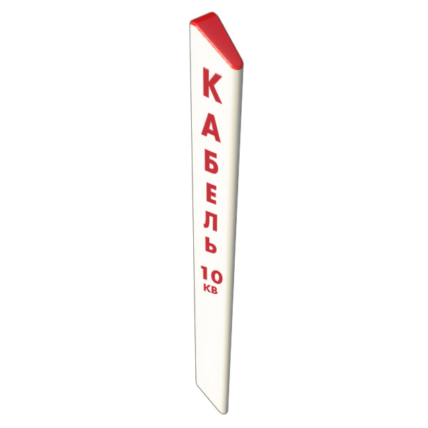 Столбик СОЭ для обозначения электропередач и кабелей связи с надписью КАБЕЛЬ, высотой 1200 мм, 2000 мм представляет из себя сигнальный столбик треугольного сечения белого цвета с красной крышкой. «Тело» имеет белый цвет, обладает ударопрочной вязкостью, достаточной для обеспечения его сохранности при выполнении работ по его содержанию (мойка, замена световозвращателей, и т.п.). Изготовлен из высококачественного полиэтилена, имеет травмобезопасную конструкцию.