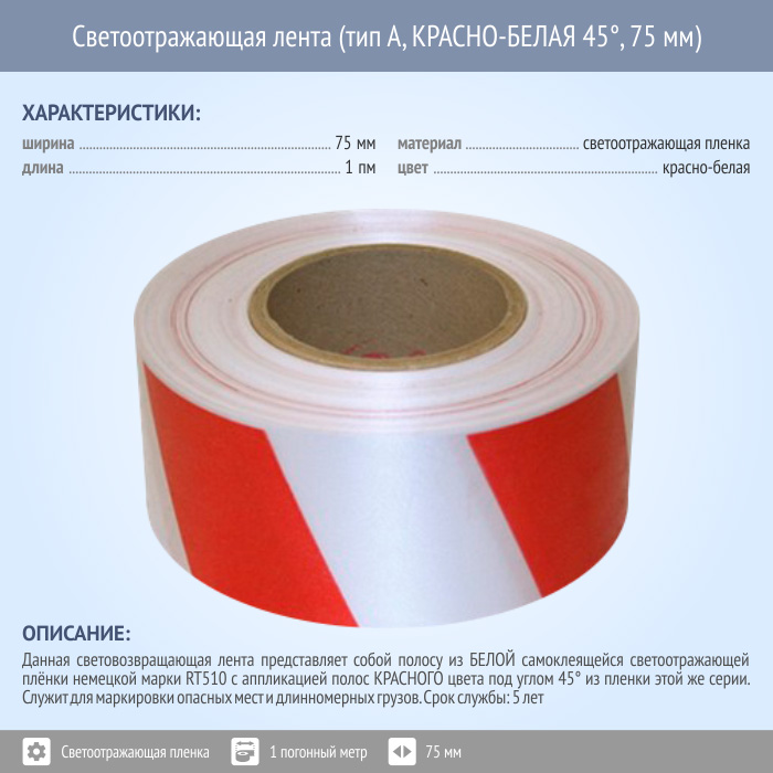 Светоотражающая сигнальная лента (тип А, КРАСНО-БЕЛАЯ 45°, 75 мм х 1 п.м.) в Бердске купить