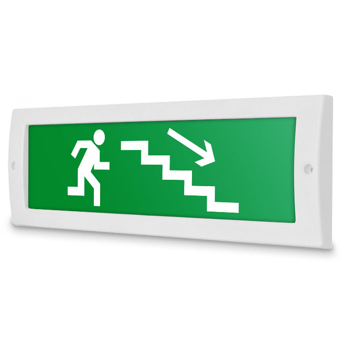 Световое табло «Направление к эвакуационному выходу по лестнице вниз (правосторонний)», Молния (12В) в Бердске купить