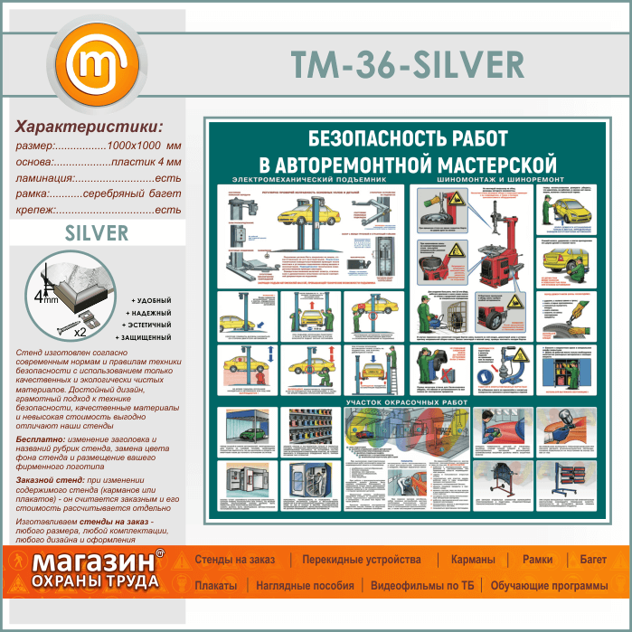 Стенд «Безопасность работ в авторемонтной мастерской» (TM-36-SILVER) в Бердске купить