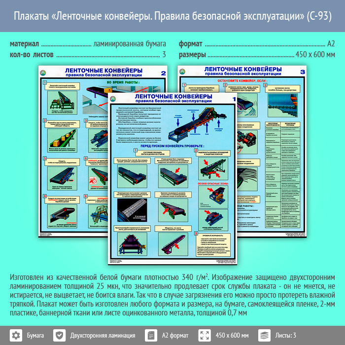 Плакаты «Ленточные конвейеры. Правила безопасной эксплуатации» (С-93, ламинированная бумага, А2, 3 листа) в Бердске купить