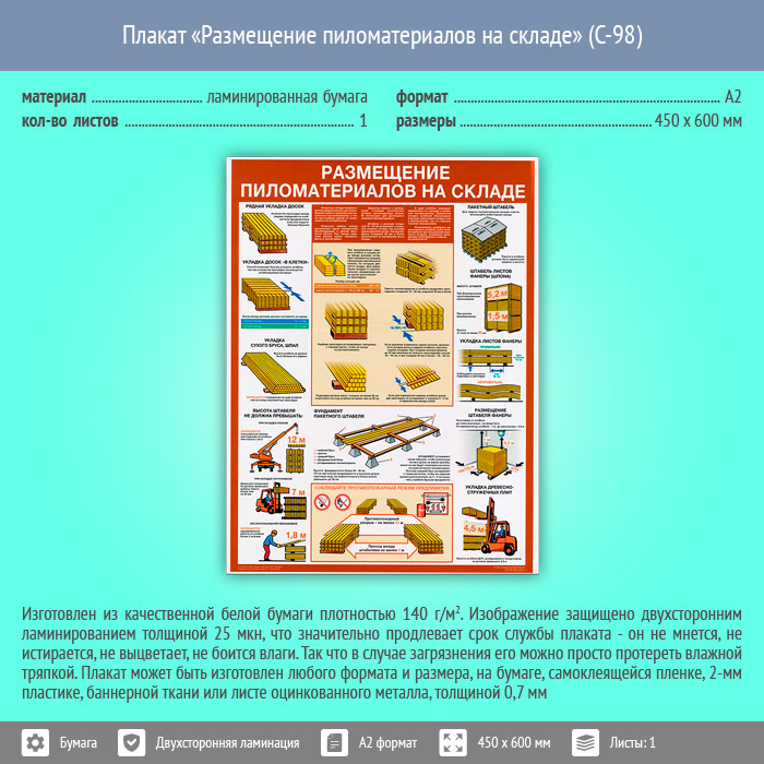 Плакат «Размещение пиломатериалов на складе» (С-98, ламинированная бумага, А2, 1 лист) в Бердске купить