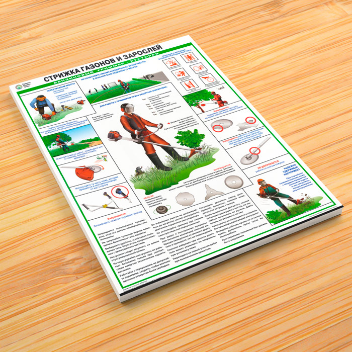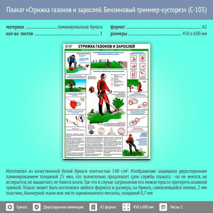 Плакат «Стрижка газонов и зарослей. Бензиновый триммер-кусторез» (С-103, ламинированная бумага, А2, 1 лист) в Бердске купить