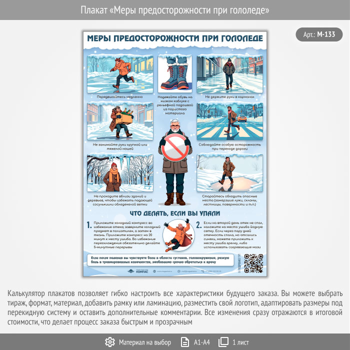 Плакат «Меры предосторожности при гололеде» с QR (М-133, 1 лист) в Бердске купить