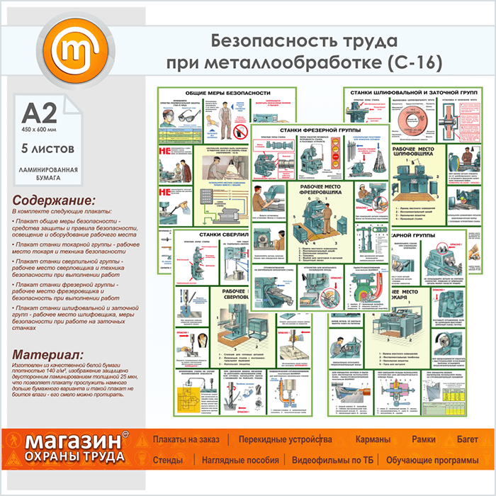 Плакат «Безопасность работ на металлообрабатывающих станках» (С-16, ламинированная бумага, А2, 5 листов) в Бердске купить