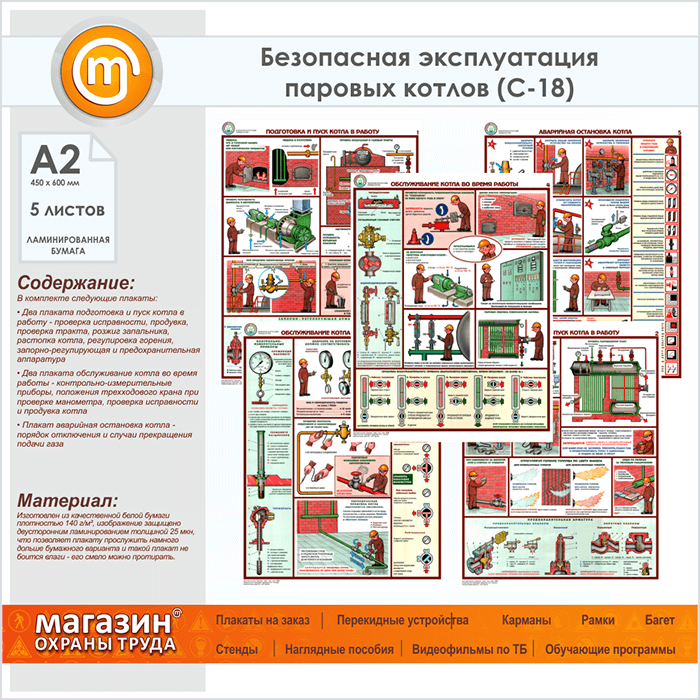 Плакаты «Безопасная эксплуатация паровых котлов» (С-18, ламинированная бумага, А2, 5 листов) в Бердске купить