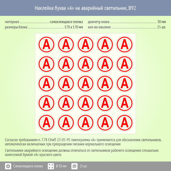 Наклейка буква «А» на аварийный светильник, B92 (пленка, диаметр 30 мм, блок 25 штук, 170х170 мм) в Бердске купить