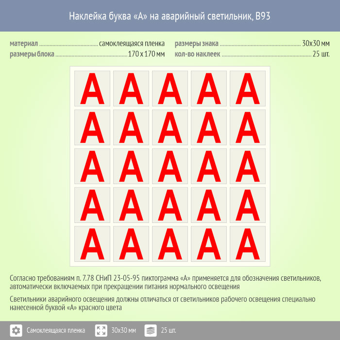 Наклейка буква «А» на аварийный светильник, B93 (пленка, 30х30 мм, блок 25 штук, 170х170 мм) в Бердске купить