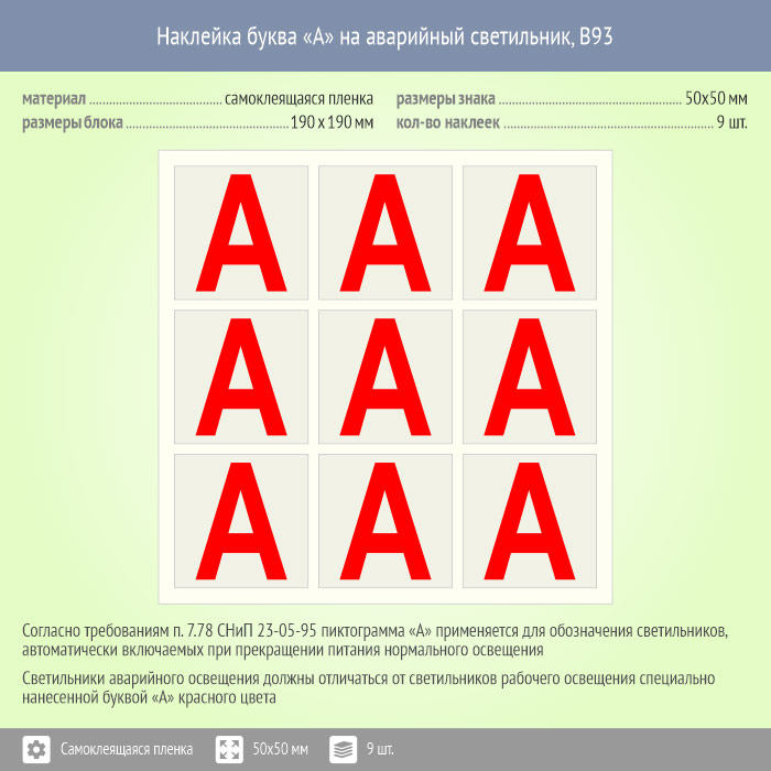 Наклейка буква «А» на аварийный светильник, B93 (пленка, 50х50 мм, блок 9 штук, 190х190 мм) в Бердске купить