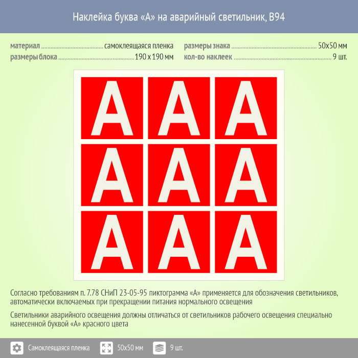 Наклейка буква «А» на аварийный светильник, B94 (пленка, 50х50 мм, блок 9 штук, 190х190 мм) в Бердске купить