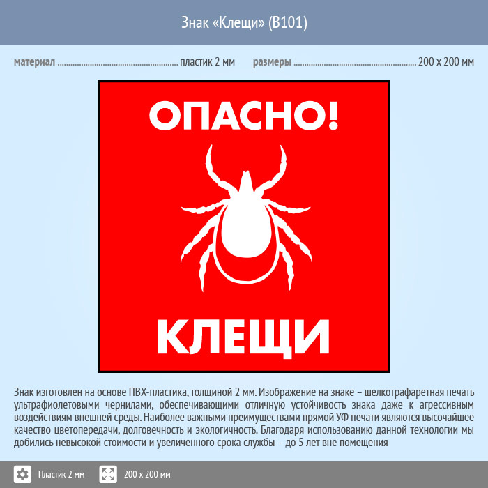 Знак «Опасно! Клещи», B101 (пластик, 200х200 мм) в Бердске купить