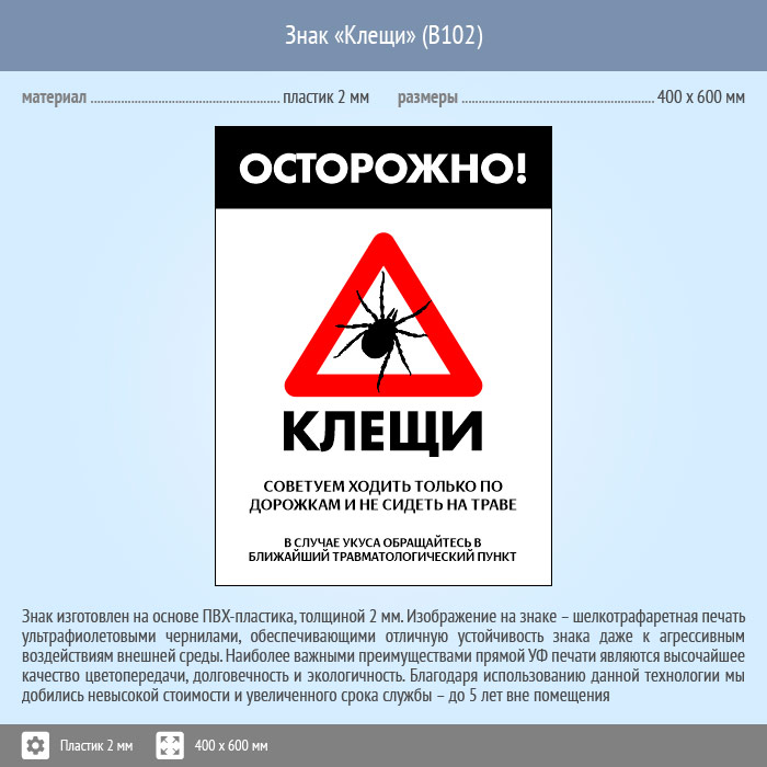 Знак «Осторожно! Клещи», B102 (пластик, 300х400 мм) в Бердске купить