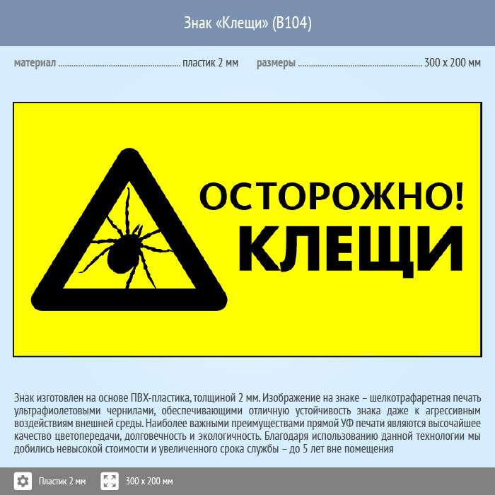 Знак «Осторожно! Клещи», B104 (пластик, 400х300 мм) в Бердске купить
