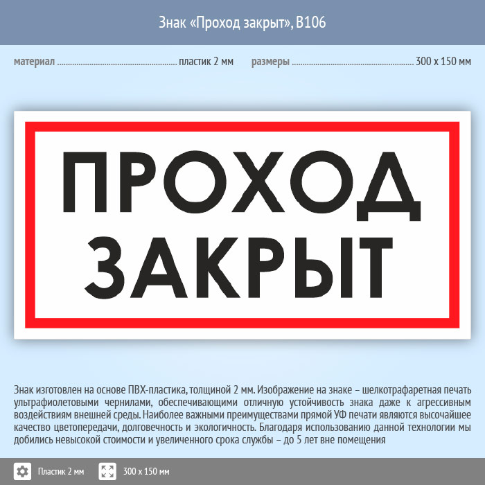 Знак «Проход закрыт», B106 (пластик, 300х150 мм) в Бердске купить