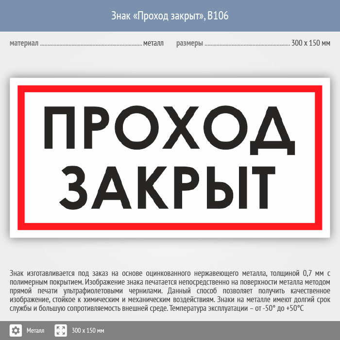Знак «Проход закрыт», B106 (металл, 300х150 мм) в Бердске купить