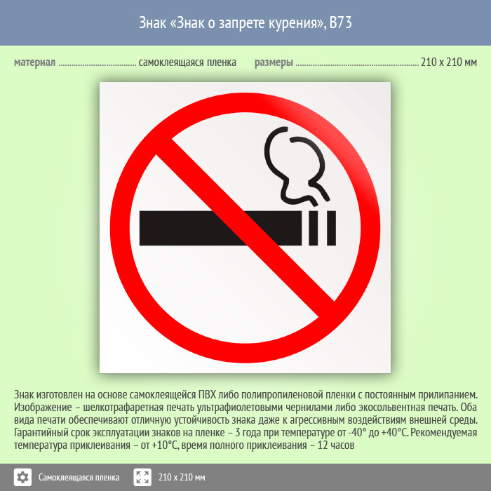 Знак «Знак о запрете курения», B73 (пленка, 210х210 мм) в Бердске купить