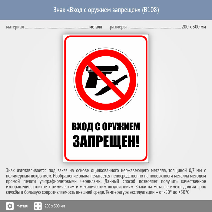 Знак «Вход с оружием запрещен», B108 (металл, 200х300 мм) в Бердске купить