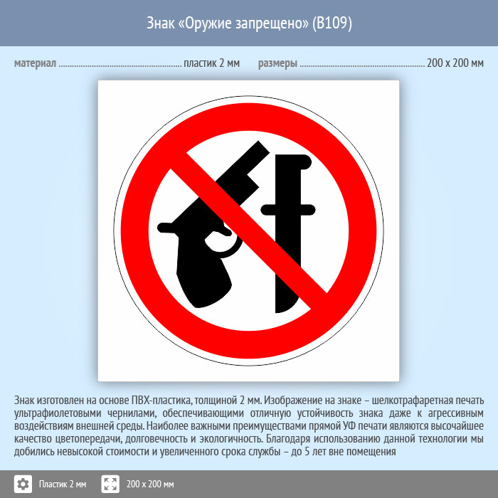 Знак «Оружие запрещено», B109 (пластик, 200х200 мм) в Бердске купить
