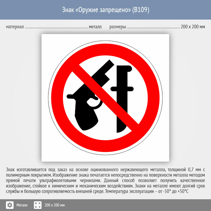 Знак «Оружие запрещено», B109 (металл, 200х200 мм) в Бердске купить