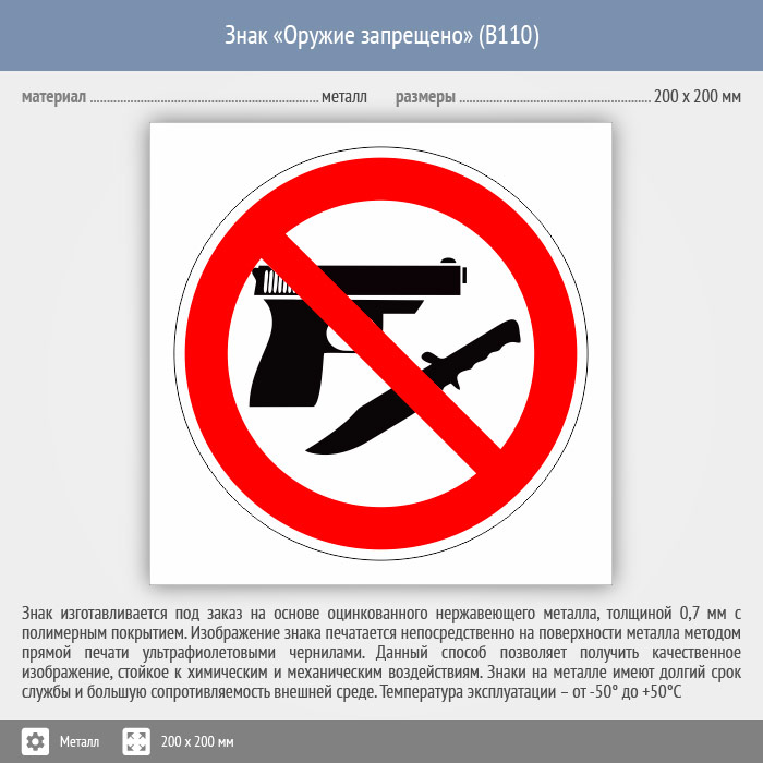 Знак «Оружие запрещено», B110 (металл, 200х200 мм) в Бердске купить