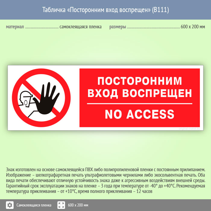 Табличка «Посторонним вход воспрещен», B111 (пленка, 600х200 мм) в Бердске купить