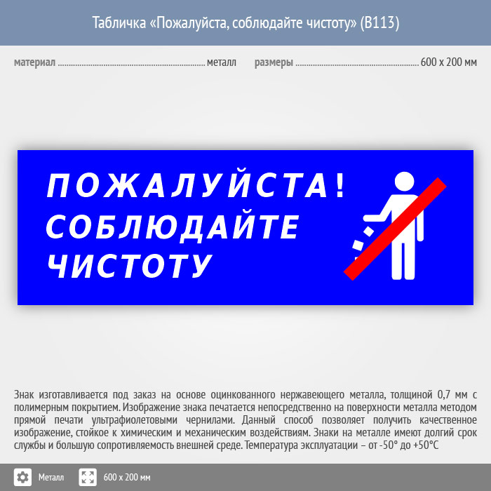 Табличка «Пожалуйста, соблюдайте чистоту», B113 (металл, 600х200 мм) в Бердске купить