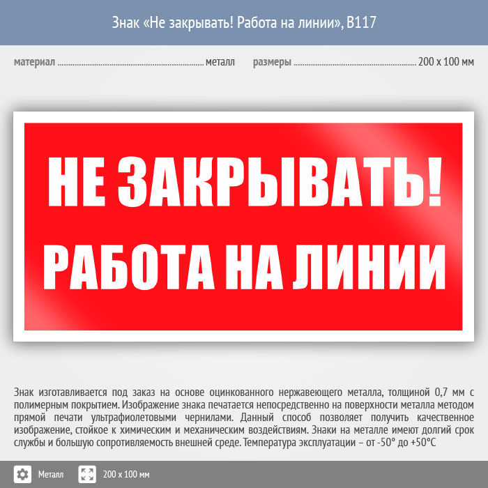 Знак «Не закрывать! Работа на линии», B117 (металл, 200х100 мм) в Бердске купить