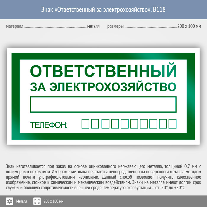 Знак «Ответственный за электрохозяйство», B118 (металл, 200х100 мм) в Бердске купить
