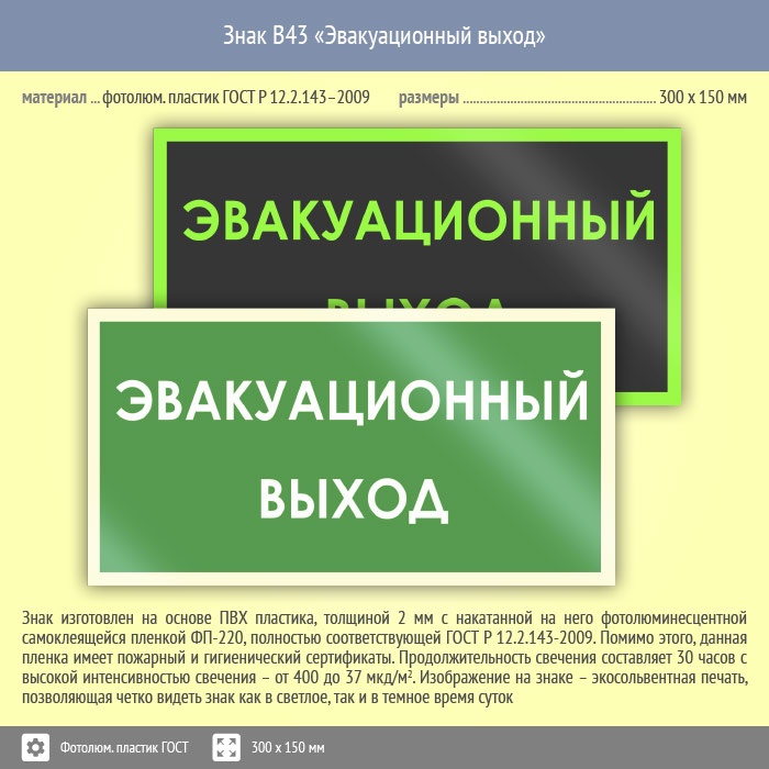 Знак B43 «Эвакуационный выход» (фотолюминесцентный пластик ГОСТ 34428-2018, 300х150 мм) в Бердске купить