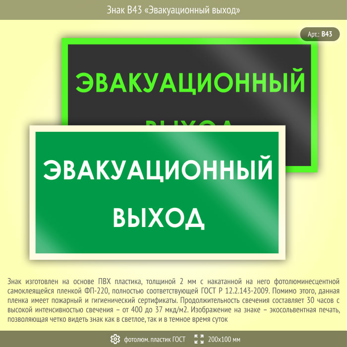 Знак B43 «Эвакуационный выход» (фотолюминесцентный пластик ГОСТ 34428-2018, 200х100 мм) в Бердске купить