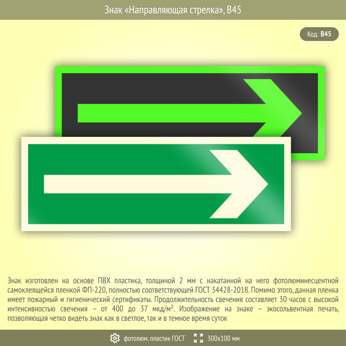 Знак «Направляющая стрелка», B45 (фотолюминесцентный пластик ГОСТ 34428-2018, 300х100 мм) в Бердске купить