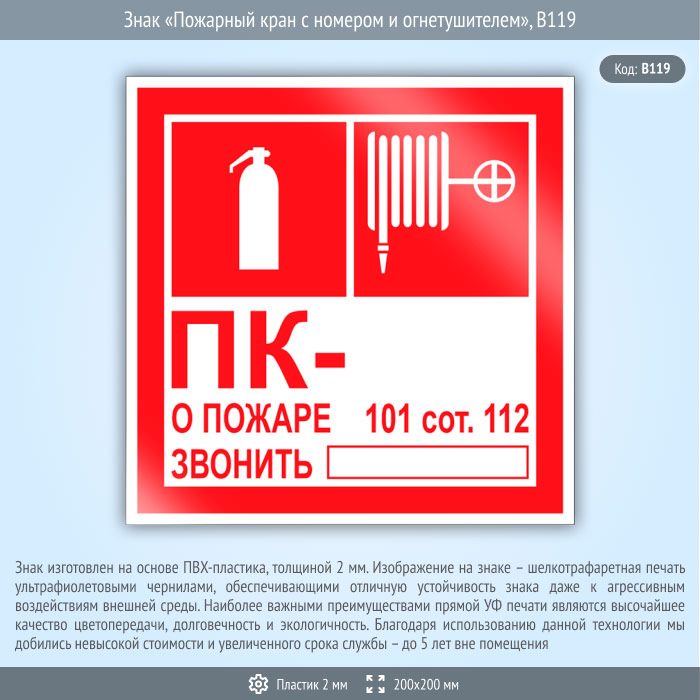 Знак «Пожарный кран с номером и огнетушителем», B119 (пластик, 200х200 мм) в Бердске купить