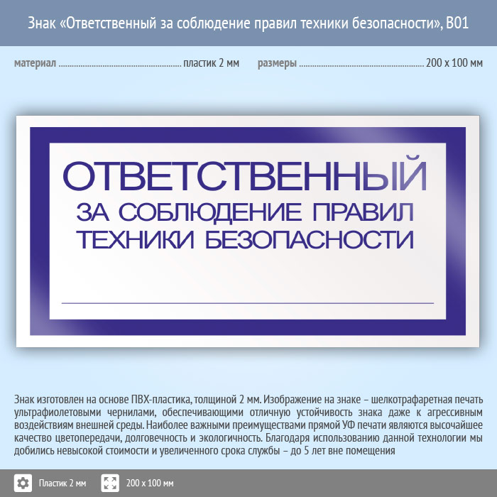 Знак «Ответственный за соблюдение правил техники безопасности», B01 (пластик, 200х100 мм) в Бердске купить