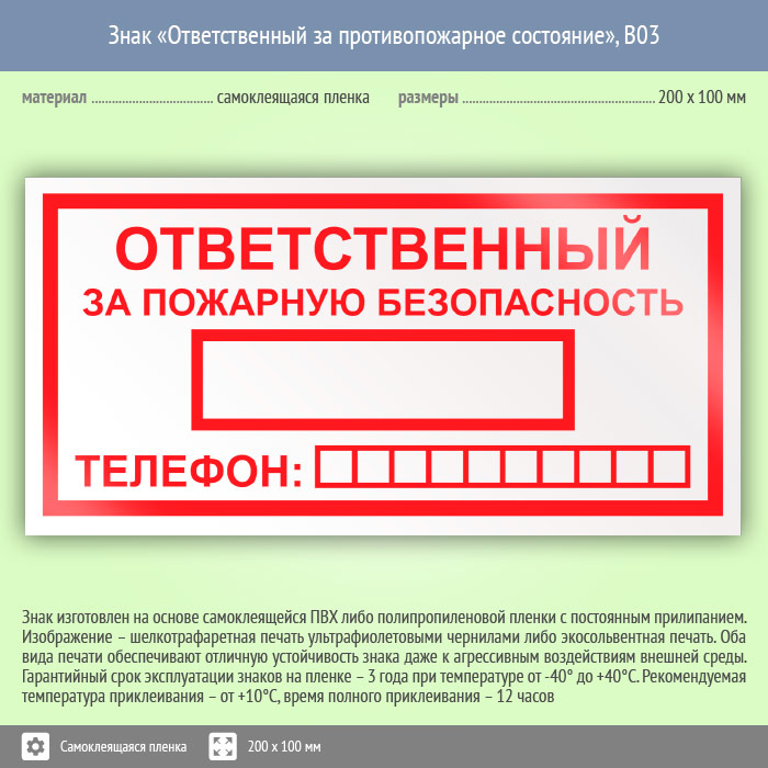 Знак «Ответственный за пожарную безопасность», B03 (пленка, 200х100 мм) в Бердске купить