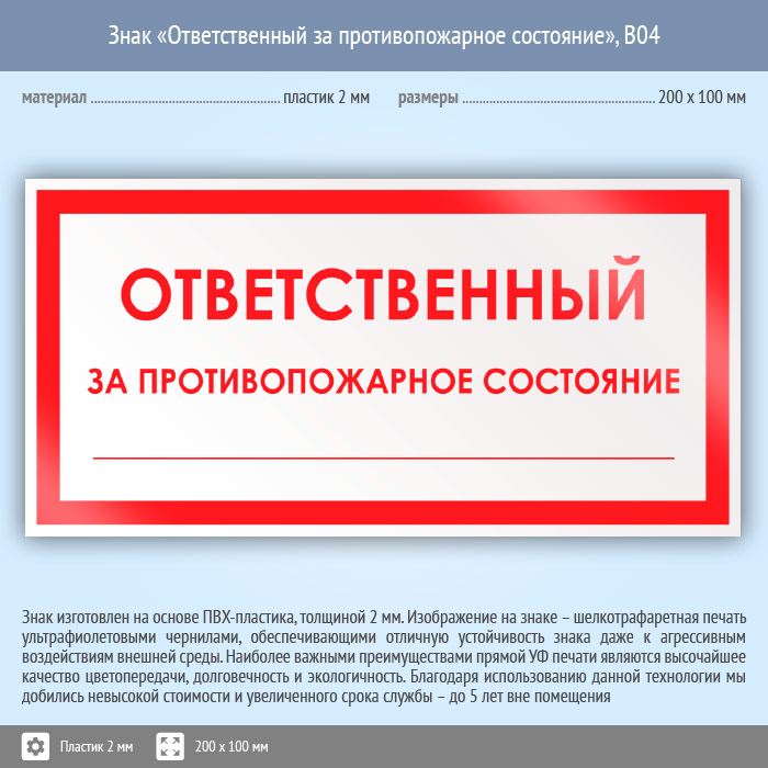 Знак «Ответственный за противопожарное состояние», B04 (пластик, 200х100 мм) в Бердске купить
