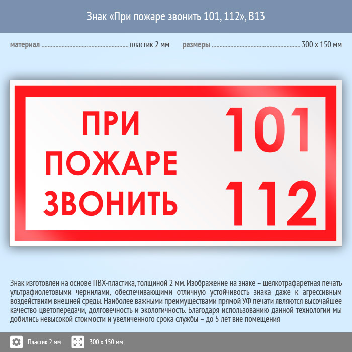 Знак «При пожаре звонить 101, 112», B13 (пластик, 300х150 мм) в Бердске купить
