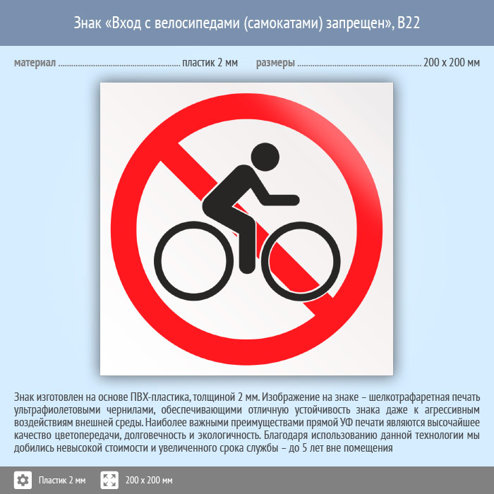 Знак «Вход с велосипедами (самокатами) запрещен», B22 (пластик, 200х200 мм) в Бердске купить