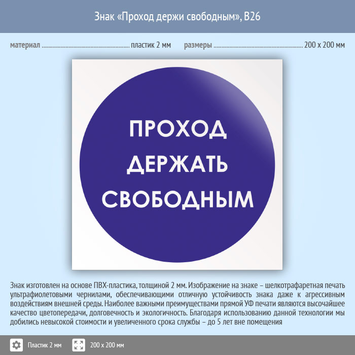 Знак «Проход держи свободным», B26 (пластик, 200х200 мм) в Бердске купить