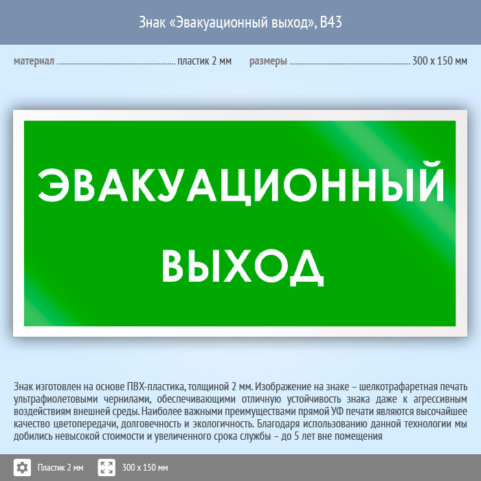 Знак «Эвакуационный выход», B43 (пластик, 300х150 мм) в Бердске купить
