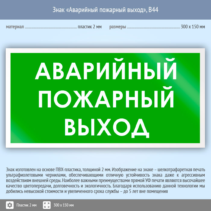 Знак «Аварийный пожарный выход», B44 (пластик, 300х150 мм) в Бердске купить