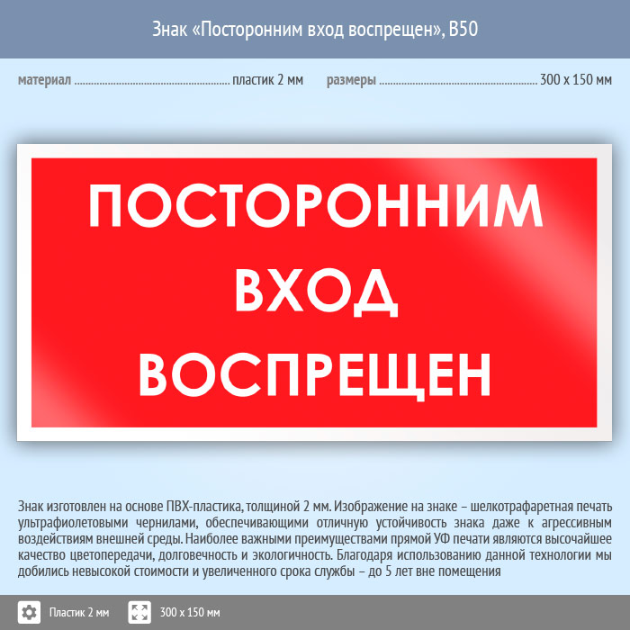 Знак «Посторонним вход воспрещен», B50 (пластик, 300х150 мм) в Бердске купить