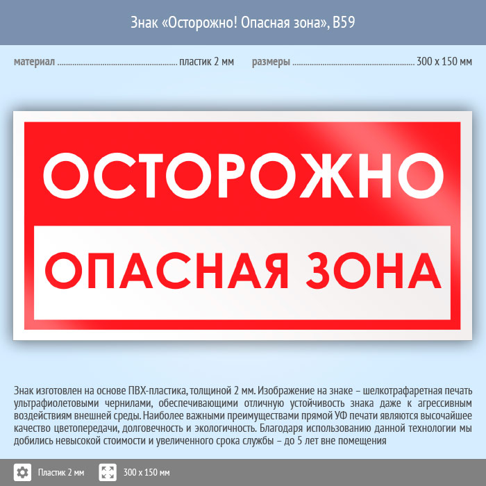 Знак «Осторожно! Опасная зона», B59 (пластик, 300х150 мм) в Бердске купить